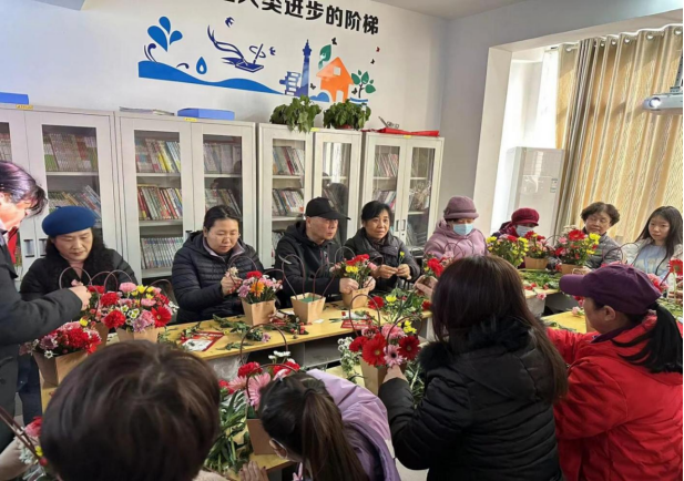 阳光正好,温暖的洒在芬芳的花朵之上,空气中弥漫着淡淡的花香。女性居民们纷纷来到活动现场,她们中有的是退休的老教师,有的是勤劳的家庭主妇。活动的主教人是一位热心的社区居民,她用亲切的话语引导着大家如何挑选花朵、如何修剪枝叶、如何插花的技巧。在她的引导下,大家纷纷动手,将一朵朵娇艳欲滴的花朵插入花瓶,感受插花带来的色彩和活力。在这个过程中,大家相互交流、分享经验,笑声和欢语充满了整个社区。她们分享着生活中的喜怒哀乐,谈论着家庭的琐事,家常理短、产米油盐。生活是他们对未来的期翼,而花朵是对未来美好的向往。