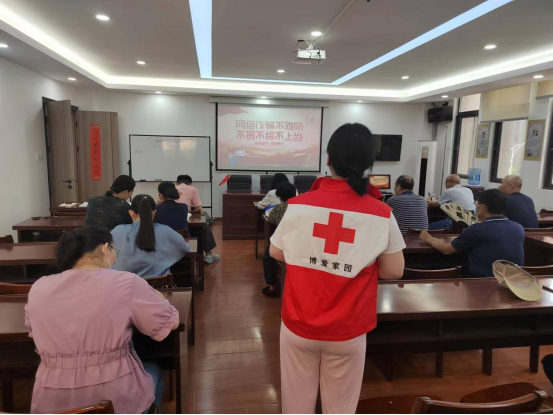 在汉源社区博爱家园讲堂内,红十字志愿者以“案例+法规”的形式开展反诈小课堂,结合发生在身边的网络贷款诈骗、刷单返利诈骗、“杀猪盘”诈骗、冒充电商物流诈骗、冒充熟人或领导诈骗、冒充“公检法”诈骗、虚假投资理财诈骗、虚假购物诈骗、注销“校园贷”诈骗、网络游戏虚假交易诈骗等诈骗类型为例,进行深入浅出地讲解。