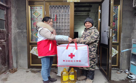 活动当天,红十字志愿者们携带米面油棉被等生活物资来到江庄村对低收入群体进行走访慰问。每到一户,志愿者们都会深入了解他们的生活状况和实际需求,详细询问困难家庭的生活状况,鼓励他们树立起对美好生活的信心,好好生活,并预祝他们过上一个欢乐祥和的春节。