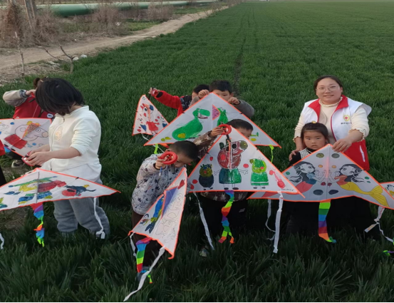 风筝制作完成后,志愿者演示了放风筝时需要注意的实际操作步骤,如栓线系扣、迎风调整角度、安全使用线轴等。随后孩子们将寓意哀思、象征着青春与梦想的风筝一起放飞,色彩斑斓的风筝随同学们手中的线恣意飘扬。