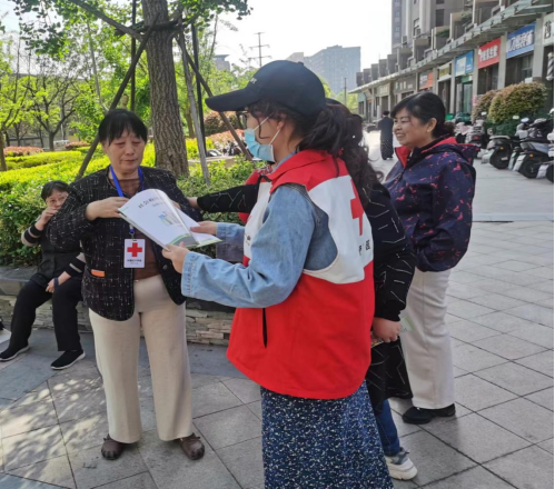 2024年4月18日上午,云龙区骆驼山街道津东社区红十字会联合志愿者们在世茂天观东门宣传救助政策。